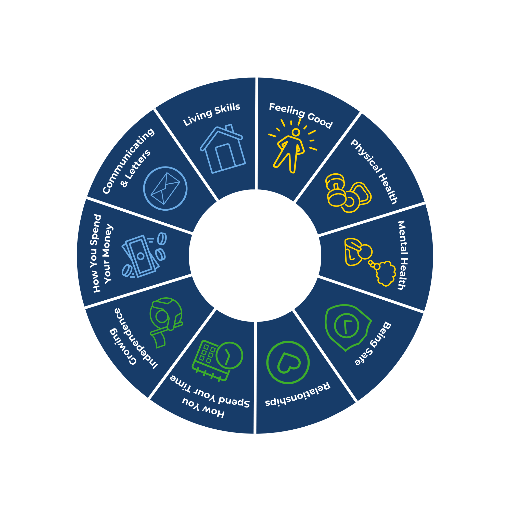 Through our Outcomes Pathway Model, we focus on 10 key areas of wellbeing – setting meaningful goals with the people we support and providing person-led care that drives real, lasting change.